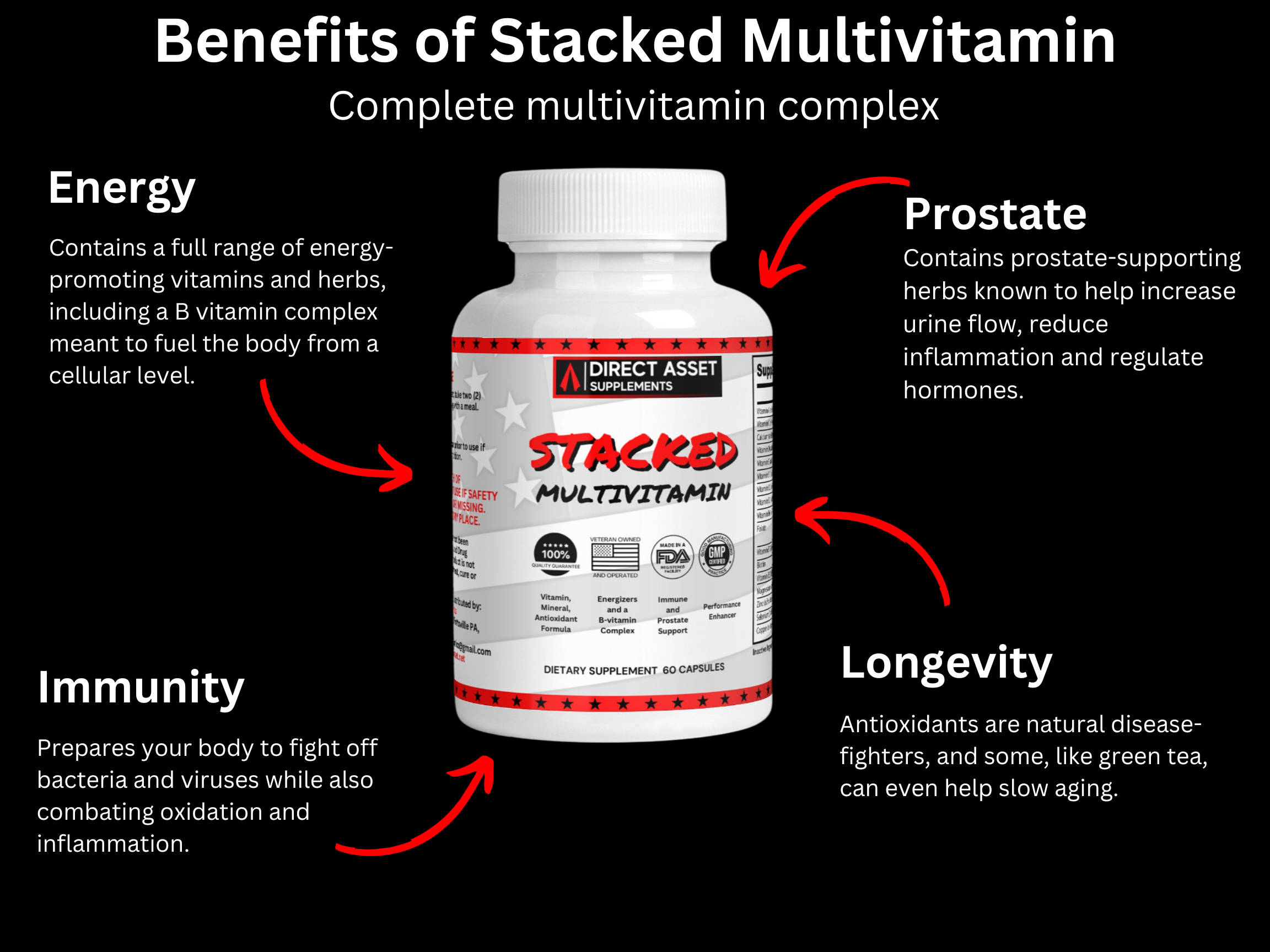 We use the word “stacked” because no other word does this quality multivitamin justice. Our multivitamin supplement comes loaded with all the crucial vitamins and minerals you need—including a vitamin B complex. But we didn't stop there. This daily vitamin also offers an entire range of natural antioxidants, like green tea, known for slowing the progression of illness and even aging