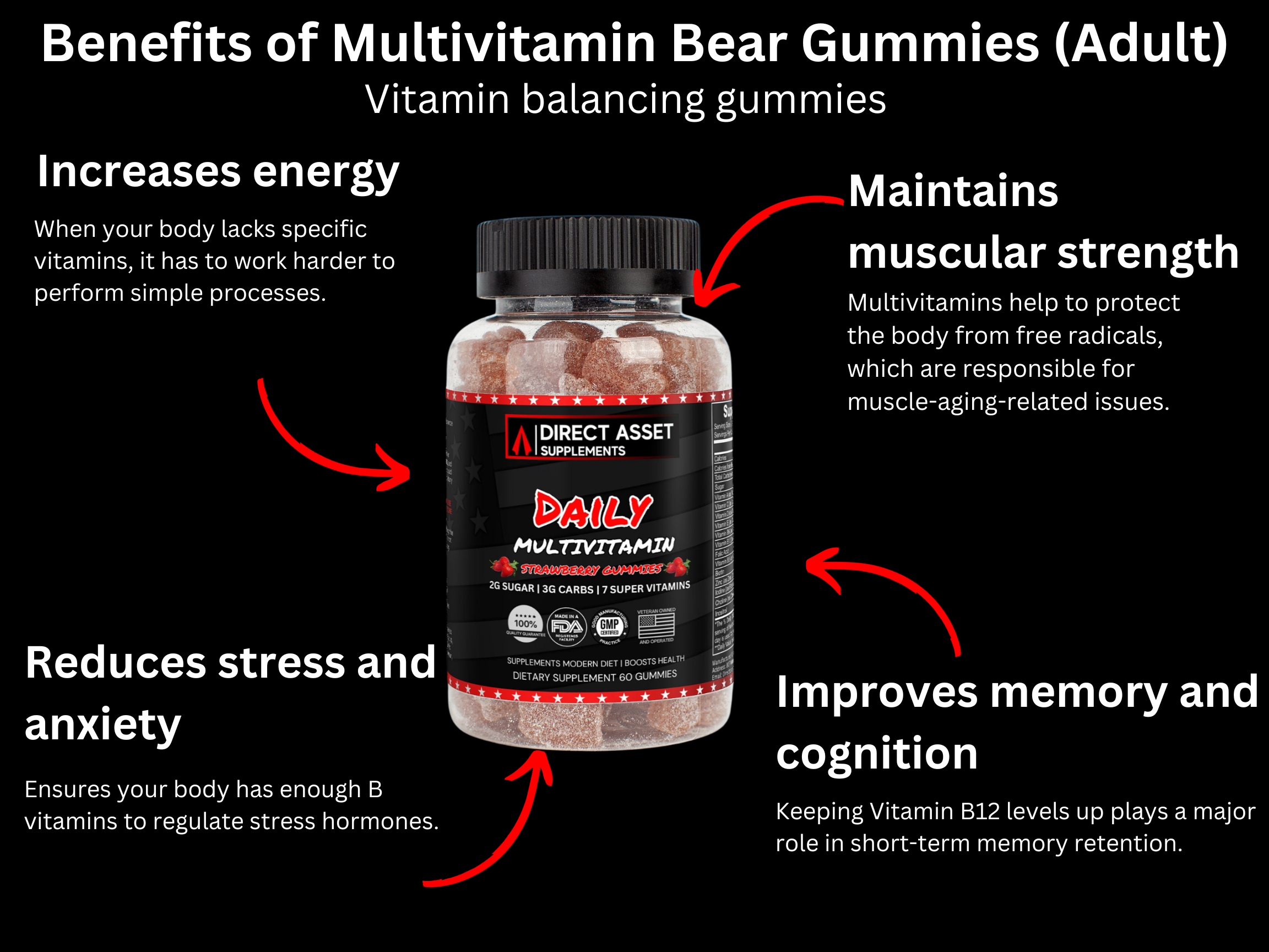 Multivitamins are taken for many beneficial reasons. These may aid in those who experience the following: Significantly affected by sleep, cardiovascular health, muscle strength, mood, and more. These multivitamin gummies are a delicious snack to get you back to your best.